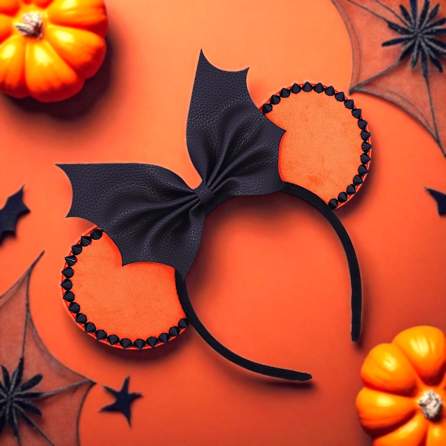 Mickey and Minnie Fans! Add a dark and spooky touch with these Spike Gothic Mouse Ears featuring an orange and black bat bow. Perfect for Halloween parties, cosplay, or theme park days—crafted for both adults and kids to enjoy in comfort and style.